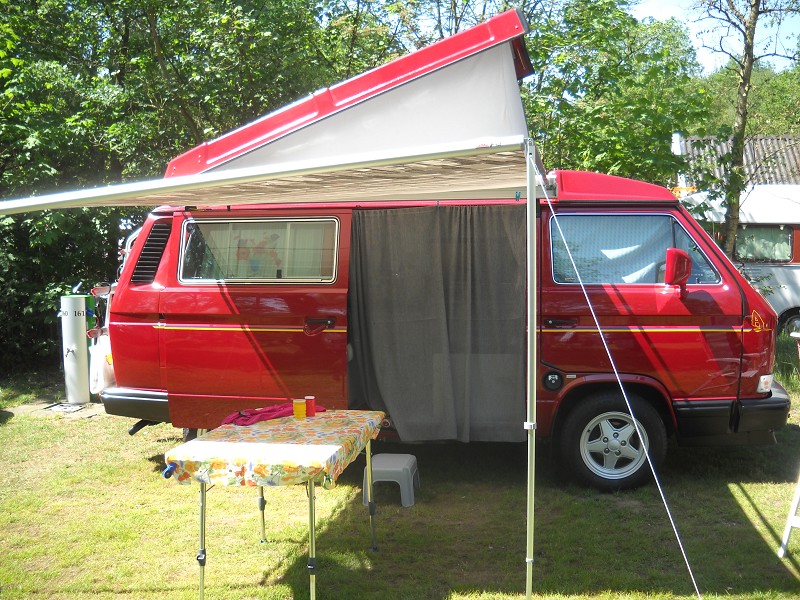 Teile des Campingparks „De Barkhoorn“ sowie eine große, an den Campingplatz angrenzende Wiese waren vom 20. bis zum 22. Mai fest in Bulli-Hand. Schon am Freitagabend war das Areal gut gefüllt und bis zum Sonntag fanden sich rund 170 Busse auf dem Gelände ein. Zur großen Freude von Kerstin und Schumi hatte man teilweise das Gefühl, ein Karmann-Treffen zu besuchen. Sieben Colorados, einen T4-Gipsy, einen T4-Karuso sowie mehrere Fahrzeuge auf T3-Basis findet man in dieser Anzahl sonst eher selten!